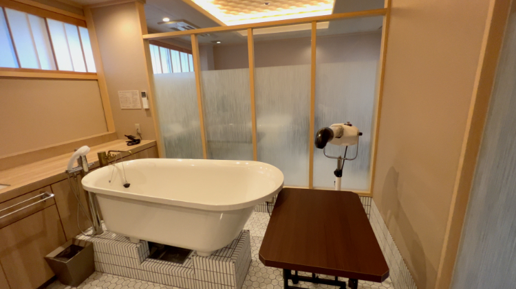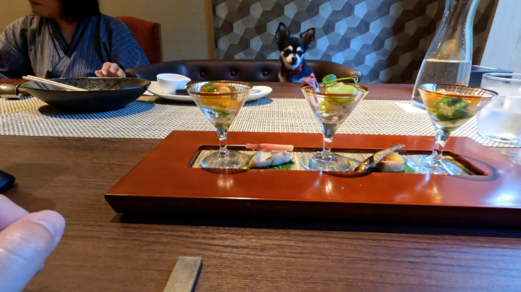 『蜉蝣の月』を一言で言うと、やっぱり“至れり尽くせり”ですね。全7室のゲストルームの内、2部屋がペット同伴可能で、犬以外のペットも受け入れてくれます。最高グレードの貴賓室では、お部屋で鉄板焼きを堪能することができ、とめ吉くん用のお料理も同じく鉄板焼きで用意してくれます。お部屋には源泉掛け流しの温泉が備わっていて、とめ吉くんも専用のバスタブで入浴できます。「お家のシャンプーはちょっと苦手だけど、温泉は気持ちよくて好きなんだワン!」と、とめ吉くんも喜んでいました。他にも、部屋のベッドの上にペットが乗ってもOKだったり、ペット用のアメニティやおやつも用意されていたり、こちらが「こういうのがあったらいいな」と思うものは、だいたい揃っています。愛犬とプライベートな空間で、鉄板焼きと温泉を楽しめるのは他にないですね。イベントやお祝いの時に利用すると、特別で贅沢な体験ができるので、間違いなく満足できる宿だと思います。