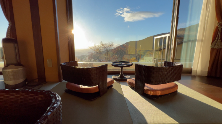 大浴場以外に貸切温泉風呂が予約制で利用でき、そのうちの1つがペット用の貸切風呂として利用できます。100%源泉掛け流しというお宿自慢の温泉をペットも満喫できちゃいます。「僕たちも何度かリピートしているお気に入りのお宿。前回は予約が取れずまだ僕は温泉に入れてないから、次こそはリベンジしたいワン!」と、とめ吉くん。ペット連れ専用のレストランで摂ることができ、部屋タイプやその日の宿泊状況によっては部屋食を選ぶことができます。『善七乃湯』はペット専用客室と一般客室が分かれていて、私たちは『特別室 雲海』に宿泊しましたが、居心地の良い間取りに加えて、なんといってもお部屋からの眺望が最高でした。