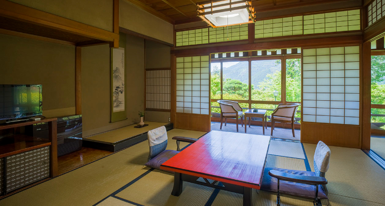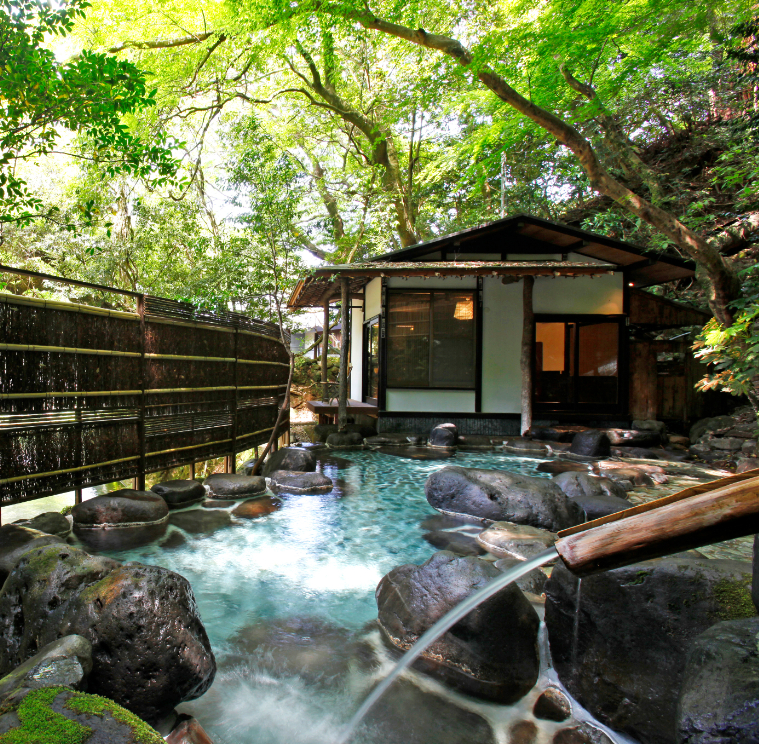 川と森に囲まれた、和の設えのリゾートホテル。3.6万坪もの広い敷地の中に、江戸時代に徳川家康の側室・お万の方が入浴していたという、温泉に入りながら森林浴もできる露天風呂はじめ、複数の温泉があります。宿泊者専用のラウンジは、大正時代からの歴史ある建物で、アールデコの雰囲気が残されています。川縁のテラスのある食事どころ「懐石茶や 水音」では五感に響く日本料理を楽しむことができ、和のムードを堪能できます。