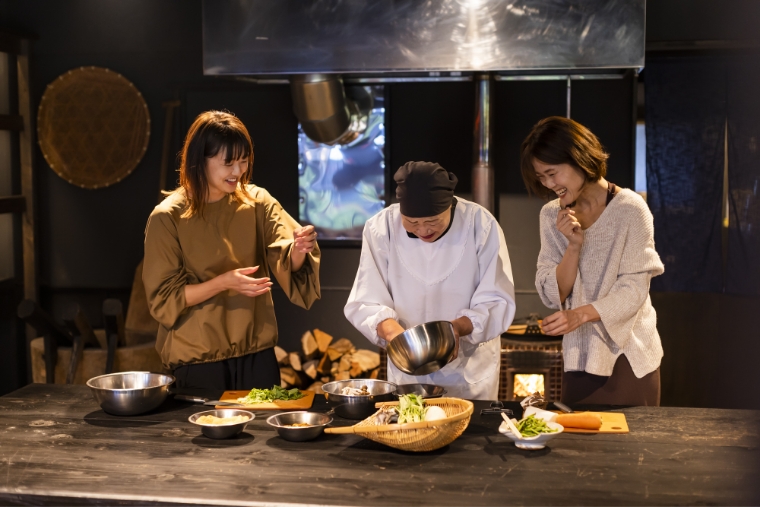 石井:そうなんです。やっぱり雪国って、雪が多い地域であるがゆえの知恵や文化がたくさんあるんですよ。『ryugon』には郷土料理を自分たちで作る『土間クッキング』というのがあって、かまどでご飯を炊いたりけんちん汁を作ったりして郷土料理と一緒に味わうことができたり、新潟の餅米でできた薄焼きせんべいを囲炉裏で焼くことができます。そういった有料のアクティビティは事前予約制のものもあれば、当日宿に着いてから部屋のタブレットで簡単に予約できるものも。グリーンシーズンだと、宿周辺でのサイクリングやトレッキングも気持ちいいです。宿周りのアクティビティには専用のガイドアプリが用意されていて、立ち寄りスポットや見どころについて案内を聞きながら巡ることもできます。
